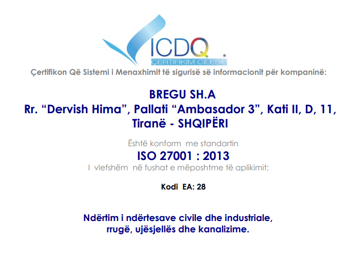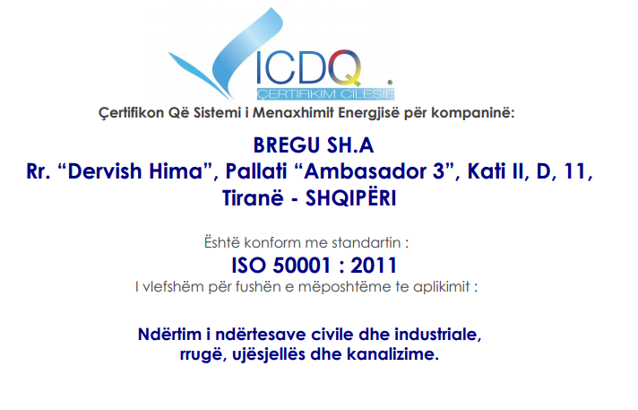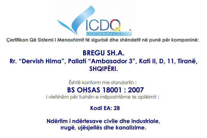 “Bregu Sh.a” has 27 years of experience in the civil construction projects, industrial, tourism, agricultural projects, reconstruction, street constructions and works of art. “Bregu sh.a” owns a variety of assets that diversify from one to another in the terms of human resources, technological equipment and feasible assets of the highest standards, of which integrated with the long experience in the market make a comparative advantage for our company in the completion of the projects, in time, with quality